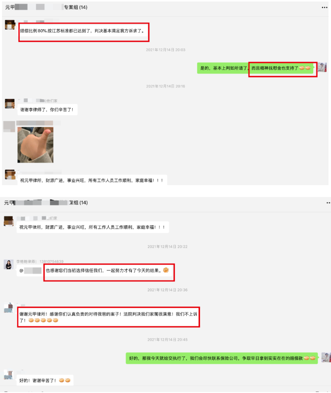 庭审中,元甲律师据理力争,并于庭后向法院提供了类案判决。经过不断争取,法院最终判决支持了按照80%的赔偿比例由肇事方承担事故责任,同时,伤残赔偿金(含被扶养人生活费)也支持按照江苏标准计算。