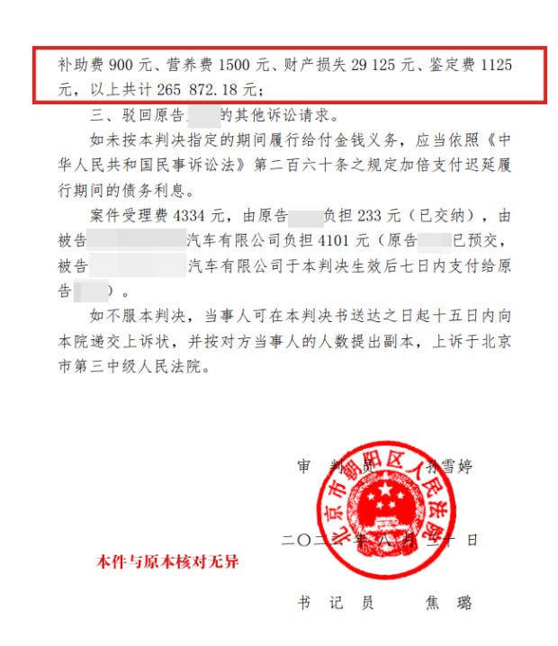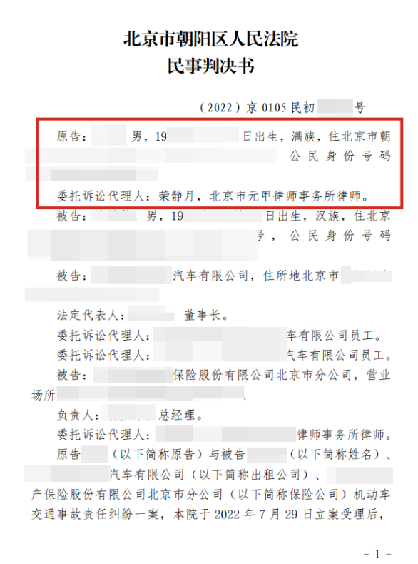 针对医疗费问题,其花费的医疗费为13.9万多元,通过自己的商业保险报销了近7.4万元,剩余近6.5万元未报销。元甲律师在研究法院裁判思路及过往代理案件的判决后,建议本案选择在朝阳法院起诉,按照全部的金额主张。庭审中说明了法律依据,并向法院提供了类案生效判决,最终本案法官全额认定了医疗费的金额,分责后帮助当事人多争取了36900元的赔偿。