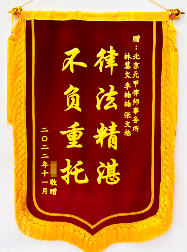 最终,经过元甲专业团队的共同努力,达成了委托人的全部诉求!一起无伤残的案件不仅得到了足额的赔偿,而且适用了北京标准,还在短短16天内就拿到自己满意的赔偿款!委托人多次表达了感谢之情,并赠送一面锦旗!