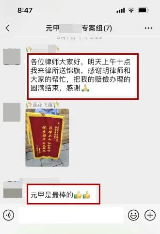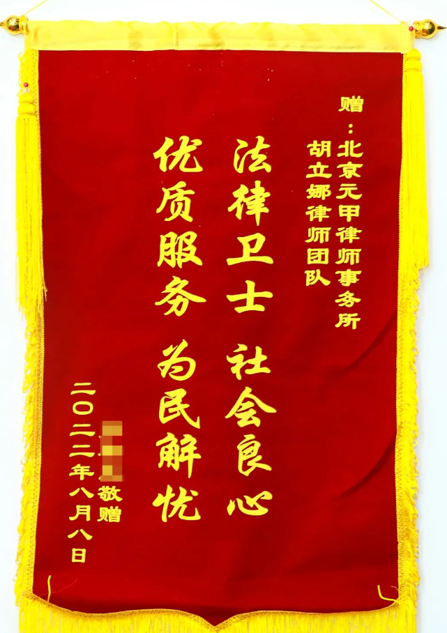 元甲办案团队专业优质的服务得到了当事人的赞扬与认可,特意送来锦旗表示感谢!