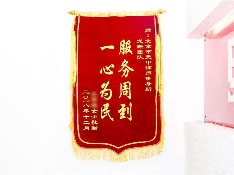 王女士没有办法,气愤之下委托专业律师事务所代理案件赔偿事宜,经过比较后委托元甲律师事务所,因朝阳法院审理案件较多,致使该案件一年多才最终出判,但是在这一年的时间里,元甲人时时刻刻心系当事人,到法院找承办法官催开庭,催判决,当事人很认可元甲律师团队专业及认真负责的工作态度,特送旗旗一面以表感谢。
