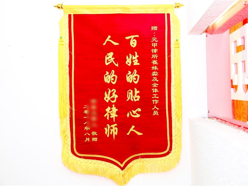 杨先生的伤情能够评定上伤残的几率微乎其微,但在我们元甲律师坚持不懈的努力下,将杨先生的伤情争取到十级伤残, 且杨先生的户籍为农村户口,在我们元甲律师团队的努力下,成功的将其农村户口转成城镇户口。 这给当事人极大的支持,后在我们元甲律师团队和杨先生的共同努力下,杨先生拿到了理想的赔偿款,让杨先生和家人高兴不已,特送来一面锦旗以表谢意。