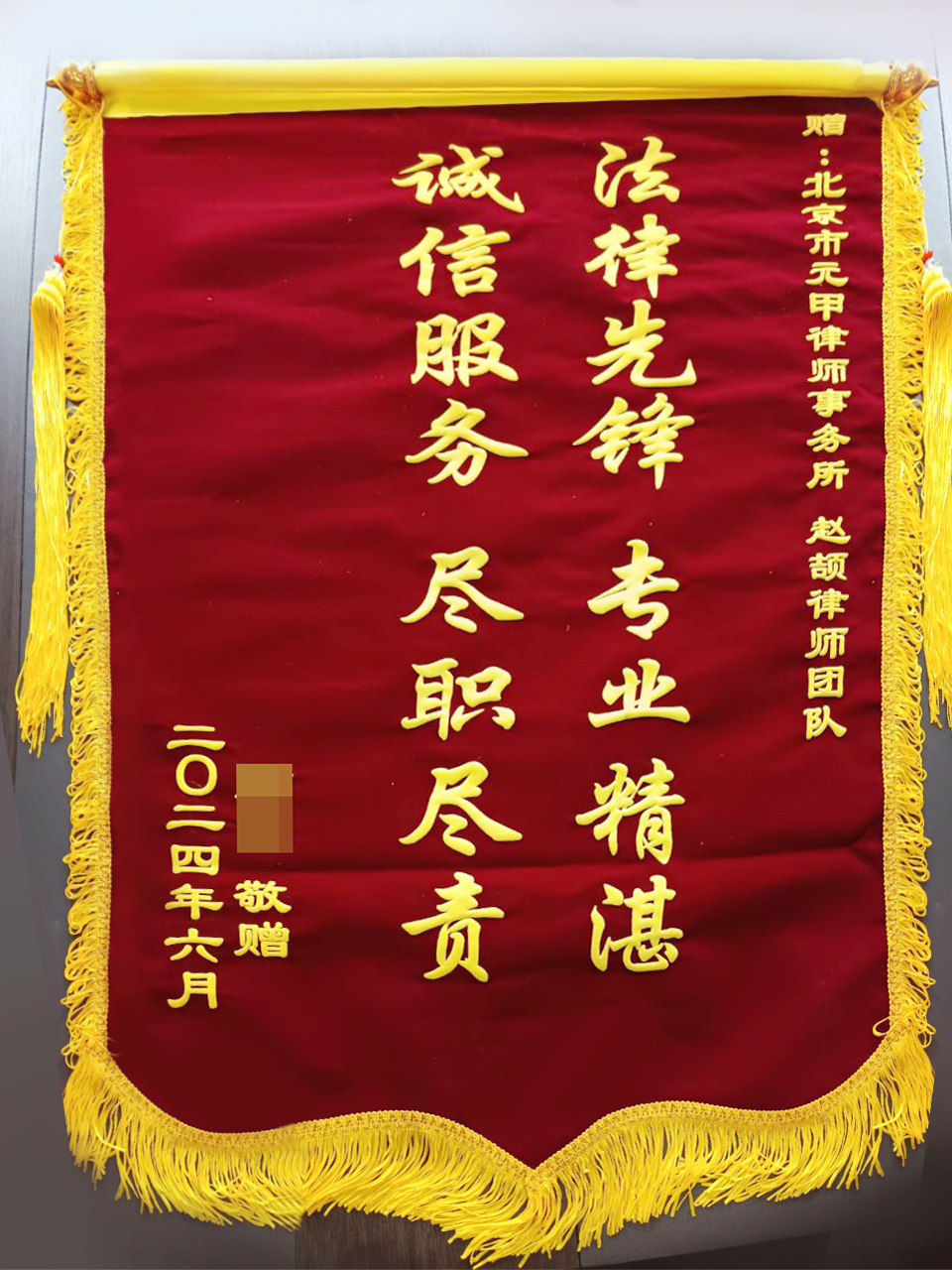 在拿到赔偿款后,石先生对元甲律所表示衷心感谢,他说:“元甲律所的律师团队非常专业、负责,对我的案件特别尽心尽力,为我争取到了应有的赔偿。我非常感激你们的帮助,让我能够尽快走出困境!”特意赠送一面锦旗表达自己的感谢之情。