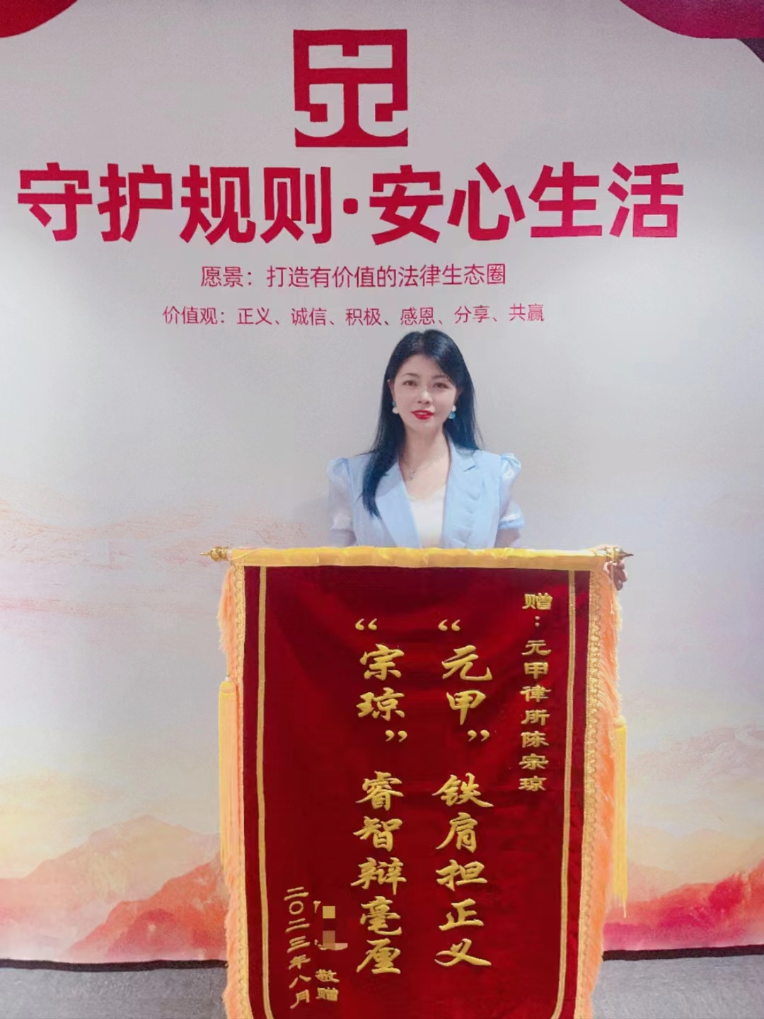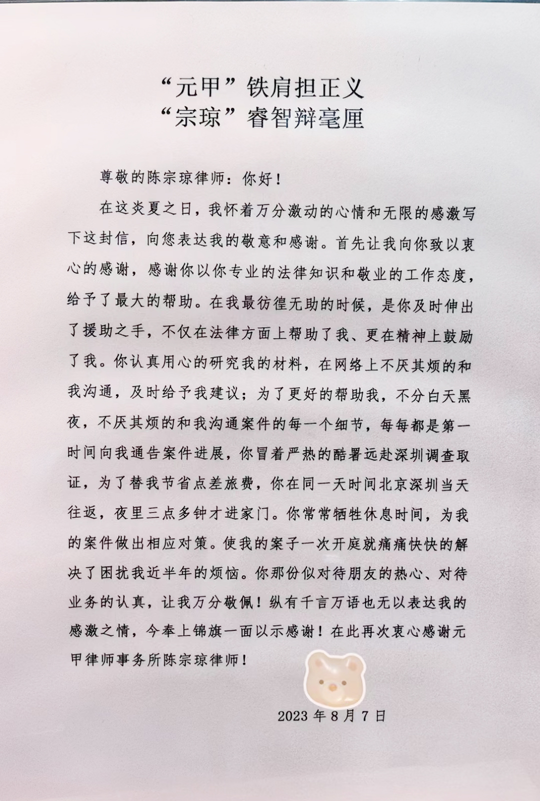 德才兼备、重情重义的刘先生,为了表达对元甲婚姻家事团队专业律师的肯定和认可,倾情书写了一封长达几百字的感谢信,并精心定制了一面锦旗:“元甲”铁肩担正义,“宗琼”睿智辩毫厘。我们也希望刘先生能够以积极乐观的态度,重新开启美好的人生下半段旅程。