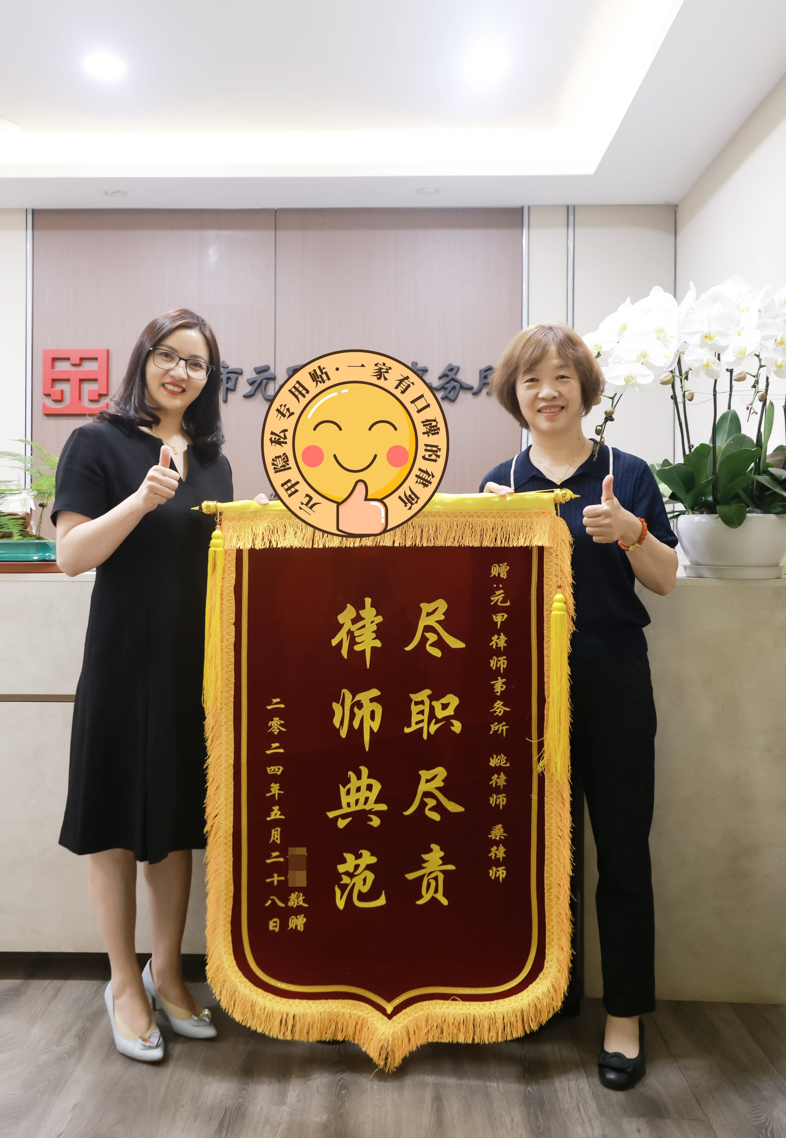 舒奶奶对于元甲律师办理的案件结果十分满意,为了表达感谢,特意亲自来律所赠送一面锦旗!