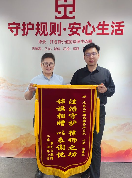 曹女士对责任划分与赔偿金额十分满意,为了表达对元甲律师的谢意,特意送来一面锦旗!