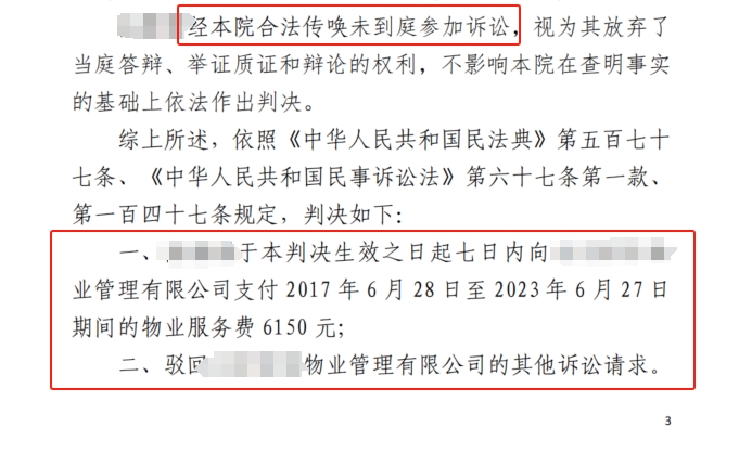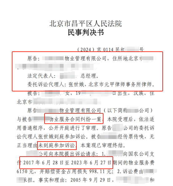 而实际上并非如此,被告业主S女士经过法官合法传唤,其找各种理由拒不参加庭审活动。法官迅速依据元甲律师提供的现有证据和法律法规展开缺席审理:判决此业主全额支付自2017年6月28日至2023年6月27日期间的物业费。