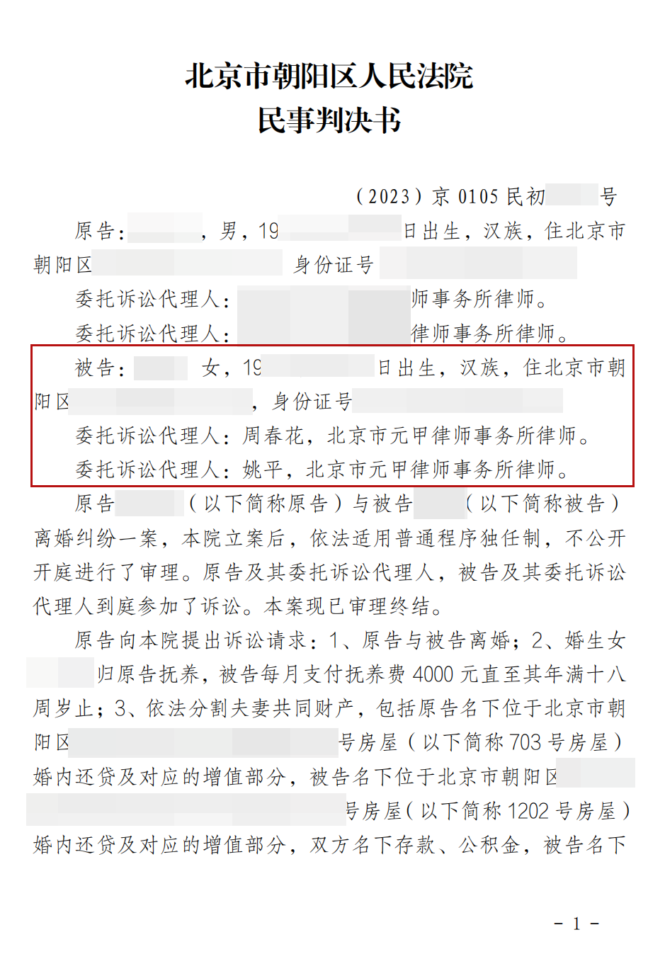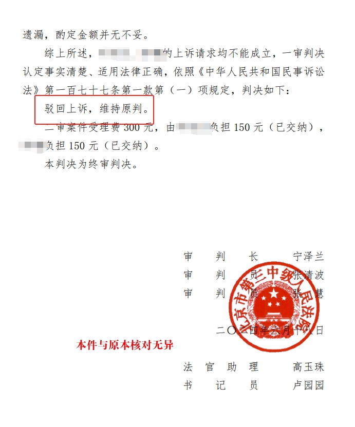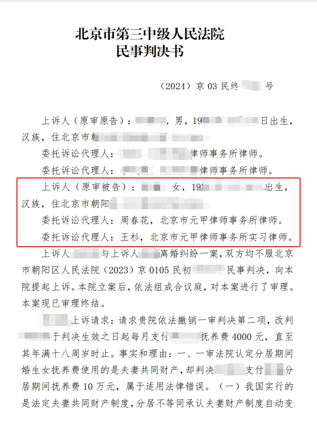 男方不服上诉,元甲律师在二审中准确把握了案件的争议焦点,巧妙地运用法律条款和司法实践为当事人维护权益,二审法院最终判决维持一审原判!