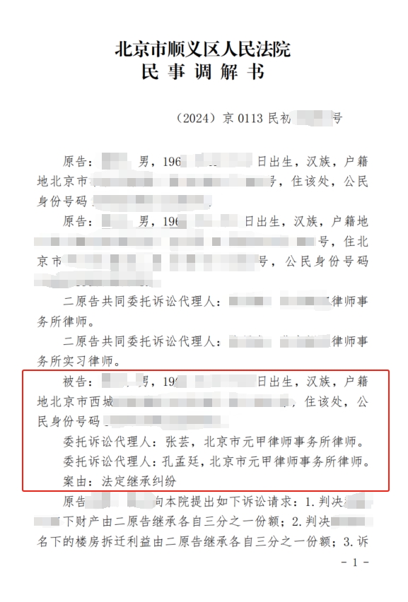 后找到北京市元甲律师事务所,经过我方的分析,被继承人虽然订立了遗嘱,但遗嘱的生效时间应是在被继承人去世后。也就是说,被继承人去世前,对其订立在遗嘱内的财产仍有处置权,被继承人去世前已经自行处置的财产不属于遗产范围,在给当事人充分分析了案件的情况后,同时元甲律师也从亲情角度出发与当事人沟通了调解方案。