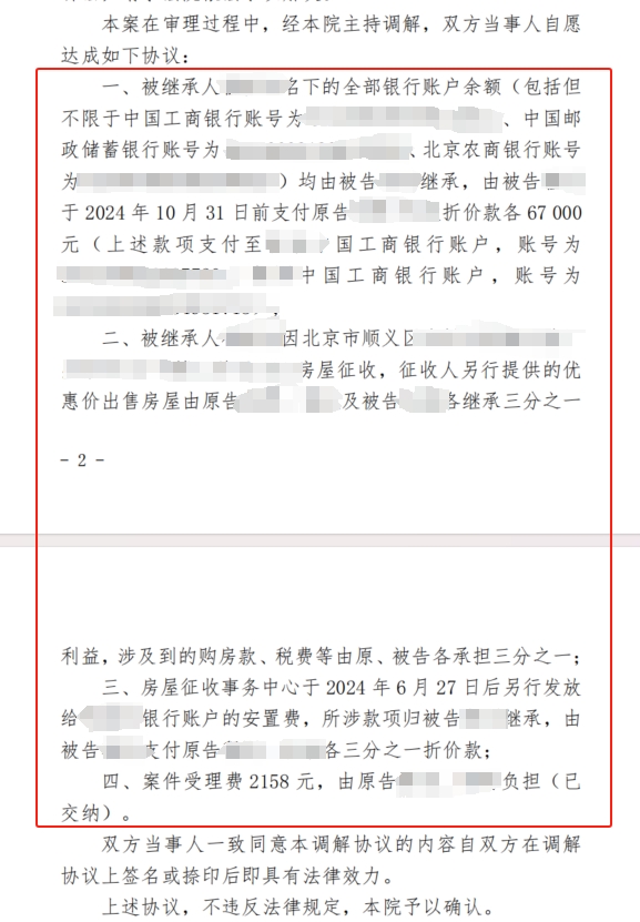 第一次开庭双方未达成调解,在对方多次查询款项未果,且我方提交了几年来我方为被继承人支付的养老院费用、医疗费用、日常营养品费用的花销后,经过法官的再次沟通,三方终于达成调解,就被继承人去世后留下的遗产进行分割,遗产按照三分之一的份额进行平分。