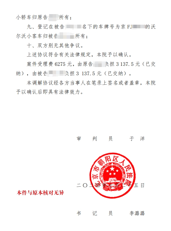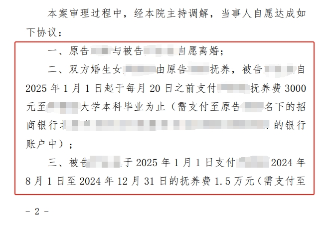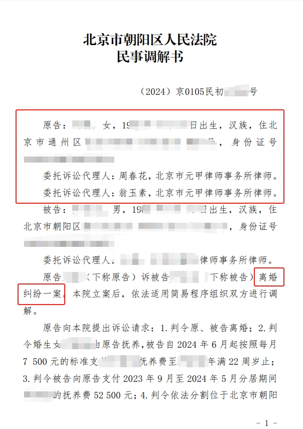 经过多轮的沟通,双方达成调解,法院出具调解书,元甲律师帮助王女士争取到了孩子抚养权、每月3000元的抚养费及50万元房屋折价款,王女士对结果十分满意!
