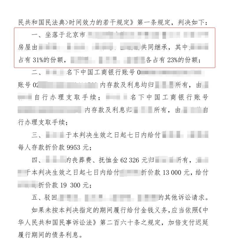 在继承比例纠纷案件中,两姐妹作为原告起诉了孟先生,要求每人继承25%的房屋份额。元甲律师全面收集证据积极应诉,证明我方为老人的共同居住人,承担了主要赡养义务,得到了法院的认可。一审法院判决,孟先生获得此房产的31%份额,其他三姐妹各23%份额,此比例高于平均份额6%,孟先生对判决的继承比例非常满意。