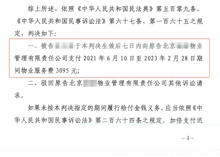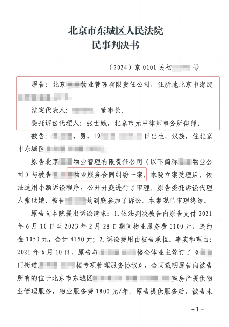 物业公司委托了北京市元甲律师事务所,由元甲律师代为出庭参加庭审活动。庭审中,业主还是坚持认为:自己没有“机动车”,没有享受到相应服务,不应当与有机动车的业主缴纳同样标准的物业费而拒绝支付物业费用。元甲律师清晰地阐明了业主欠费的事实与法律依据。最终,法院判决业主全额支付2021年6月10日至2023年2月28日期间的物业费。