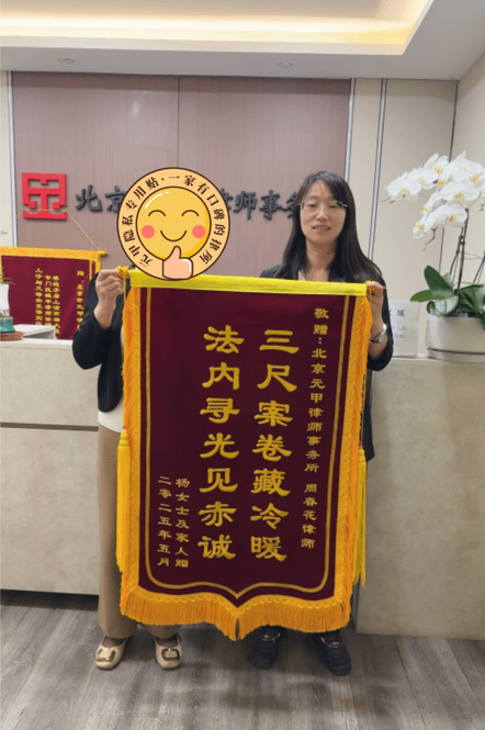 这一结果完美契合了杨女士最深切的诉求。元甲律师的专业、敬业以及对委托人母亲情怀的深刻理解,赢得了杨女士的高度认可。结案后,杨女士特地送来锦旗致谢。