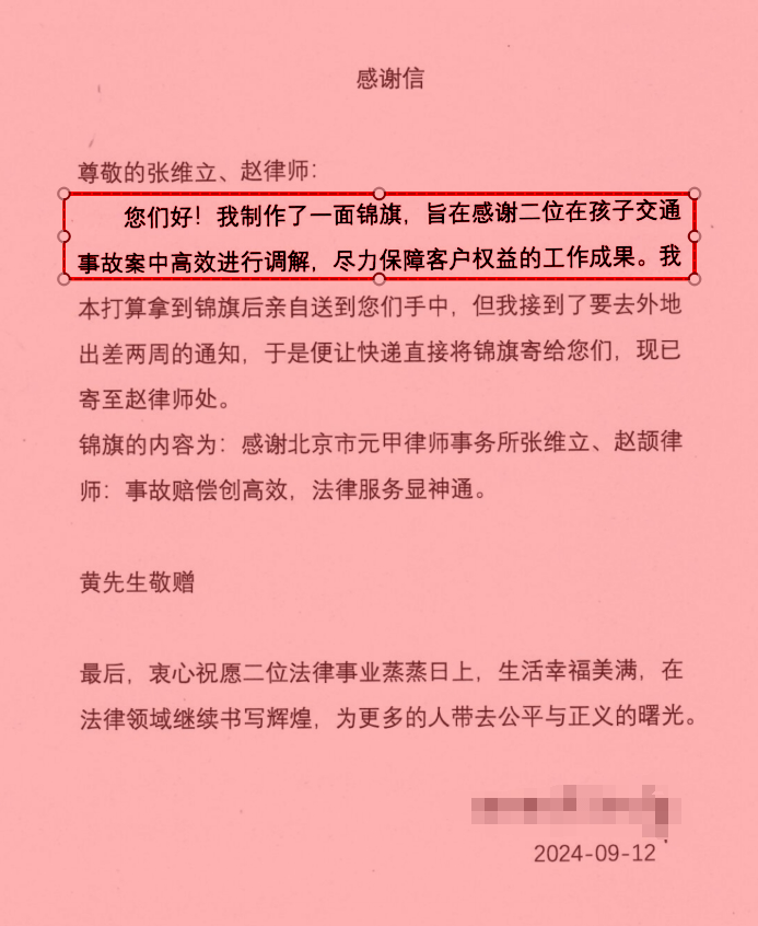 小瑞家人感慨地说:“是元甲律所给了我重新站起来的勇气和信心。你们专业、高效的服务让我感受到了法律的温暖和力量。”小瑞家人送上了锦旗并送上感谢信表达感谢之意。