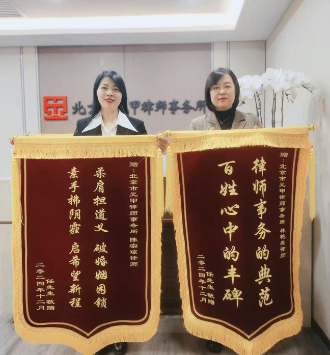 为了表达对元甲律师的肯定和认可,任先生在微信专案组群里发表了一段感人肺腑的致词,并精心订制了两面感谢锦旗,刺字:“柔肩担道义,破婚姻困锁;素手拂阴霾,启希望新程”、“律师事务的典范、百姓心中的丰碑”。