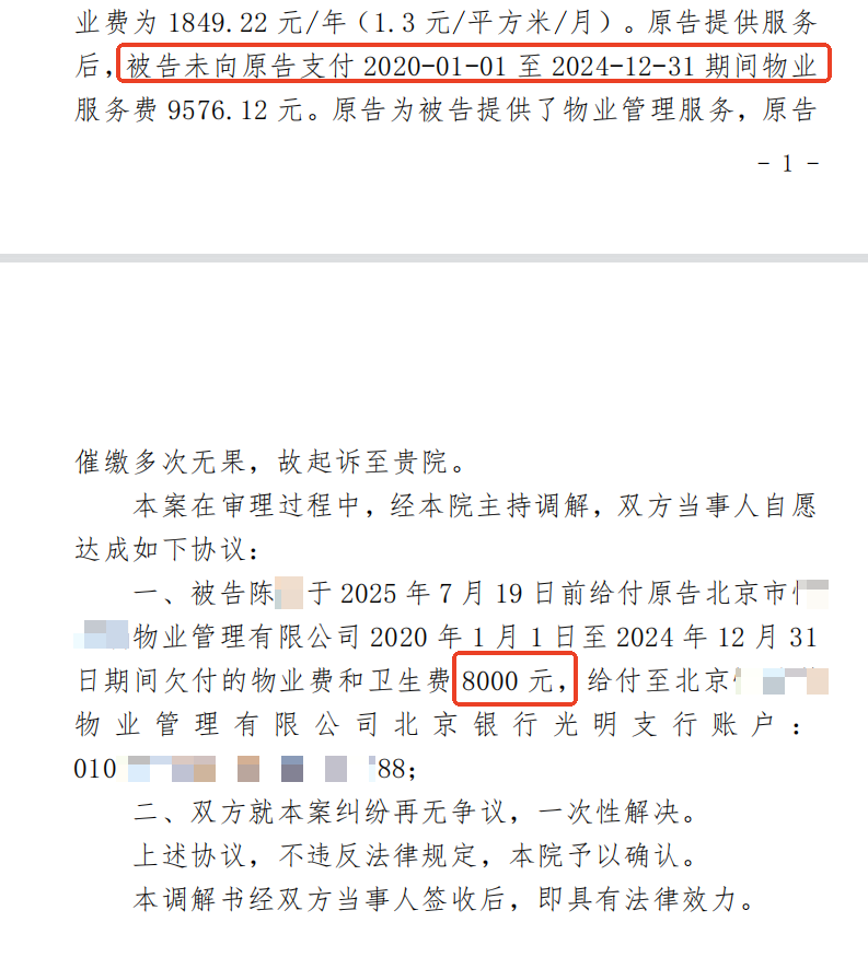 经丰台右安门法庭庄法官组织庭前调解,法官耐心了解业主实际困难并予以情绪疏导,我方代理人亦积极配合、释法明理,最终双方达成一致,物业公司顺利收到调解款项8000元。