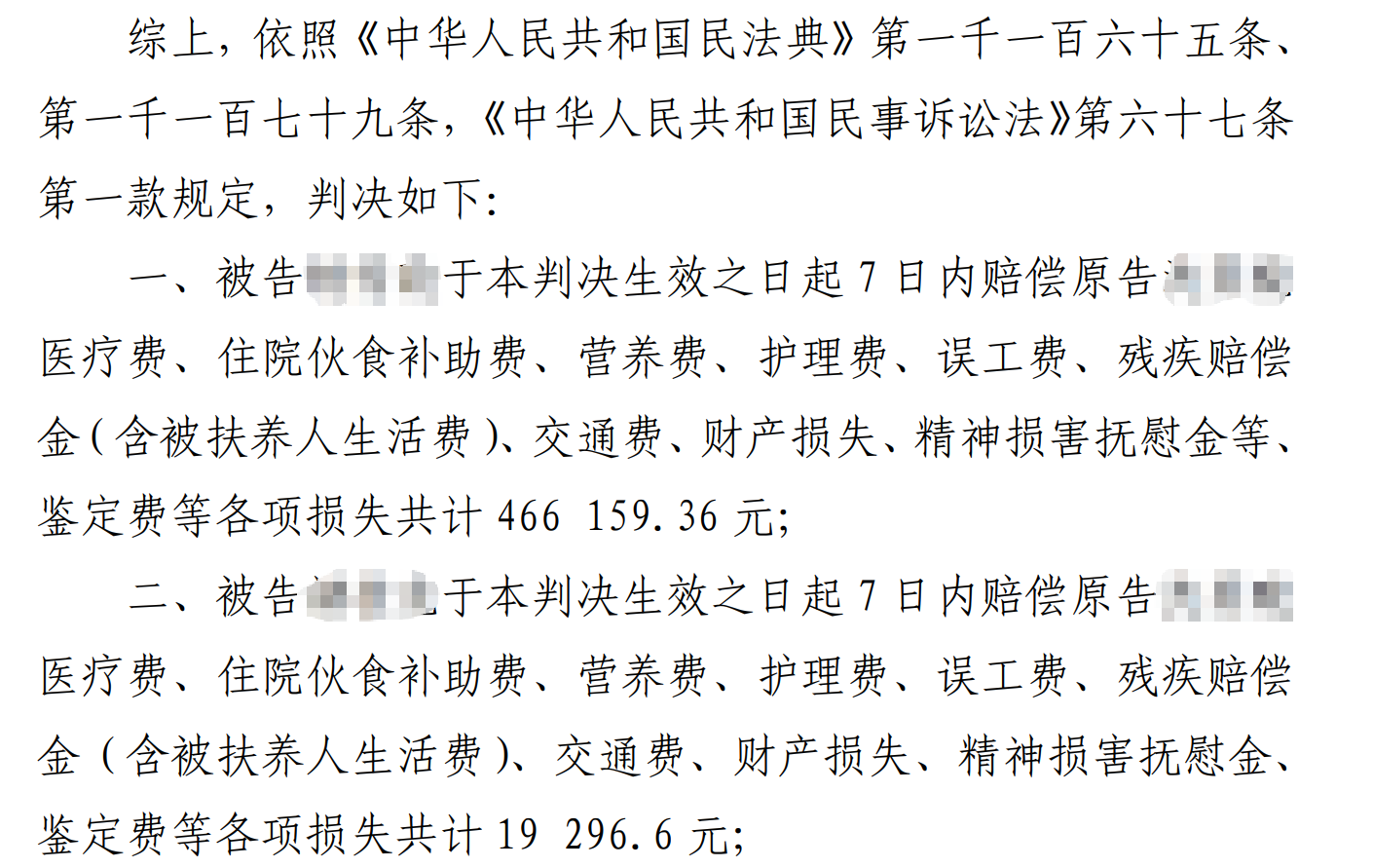 判决赔偿医疗费、护理费、误工费、残疾赔偿金、精神抚慰金等总计48.6万元(扣除事发后二人垫付的8万余元)。