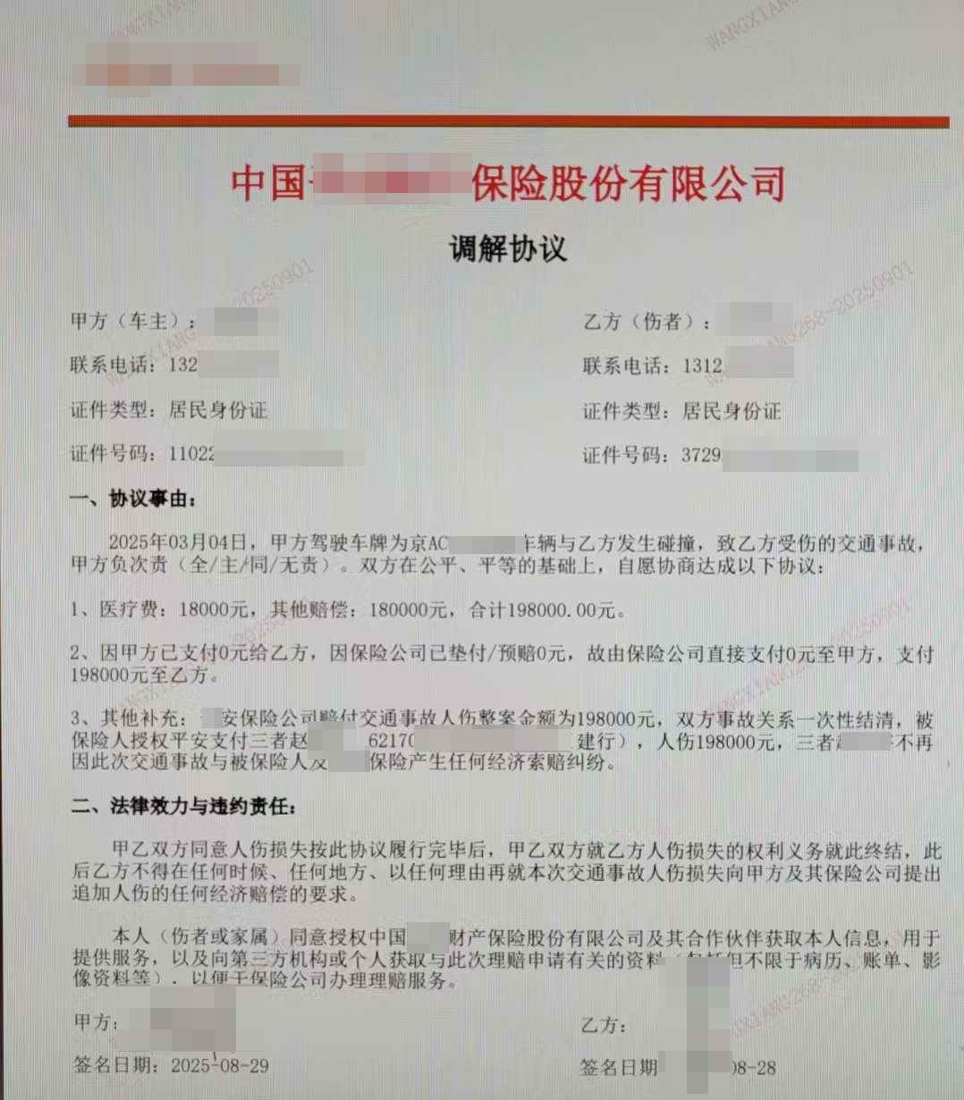 鉴定结果拿到后,元甲谈判组优先沟通,找到对方司机及保险公司谈判,保险公司一看是我们元甲找到的他们,直接答应和解,最终双方敲定,由保险公司支付包括伤残赔偿金、医疗费、误工费、营养费、护理费等各项费用合计19.8万元,帮助客户赵女士获得远超期待的赔偿,事后她非常认可元甲办案团队的服务能力,特别送上一面精心设计的锦旗。