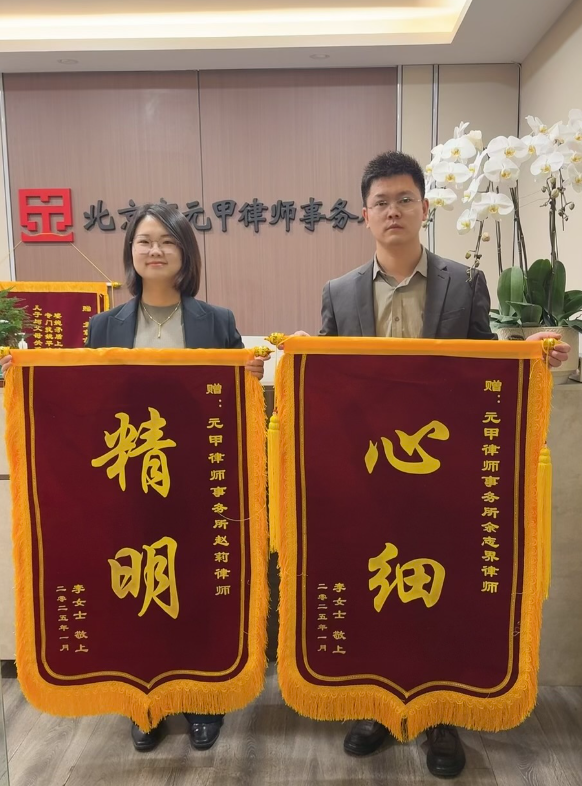 李女士对此办案结果非常满意,特意给元甲律师送来定制的锦旗表达对元甲律师的感谢!