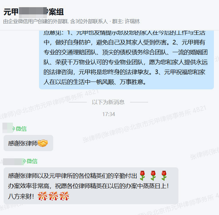 “我们公司处理各类法律事务,对北京律所相当了解。遇到交通事故,元甲是不二选择。”张先生坦言。