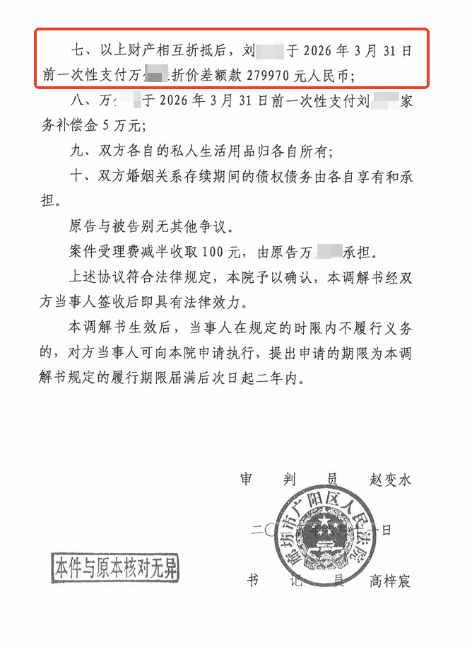 - 刘女士向万先生支付财产折价款279,970元。