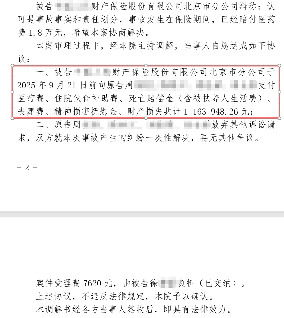 元甲律师系统梳理证据材料,精心撰写法律文书,最终案件顺利在北京市东城区人民法院立案。庭审过程中,元甲律师展现出卓越的专业素养与娴熟的调解技巧,通过扎实的证据与有力的法律论证,成功促成调解,为周女士家属赢得了对方保险公司116万元的赔偿!