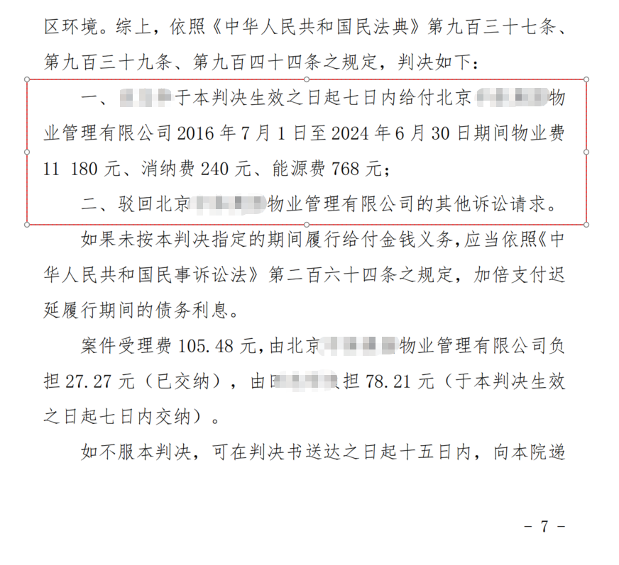 最终,法院完全支持了物业公司的诉讼请求,判决田女士向物业公司支付2016年7月1日至2024年6月30日期间的物业费11180元、消纳费240元、能源费768元等全部费用。