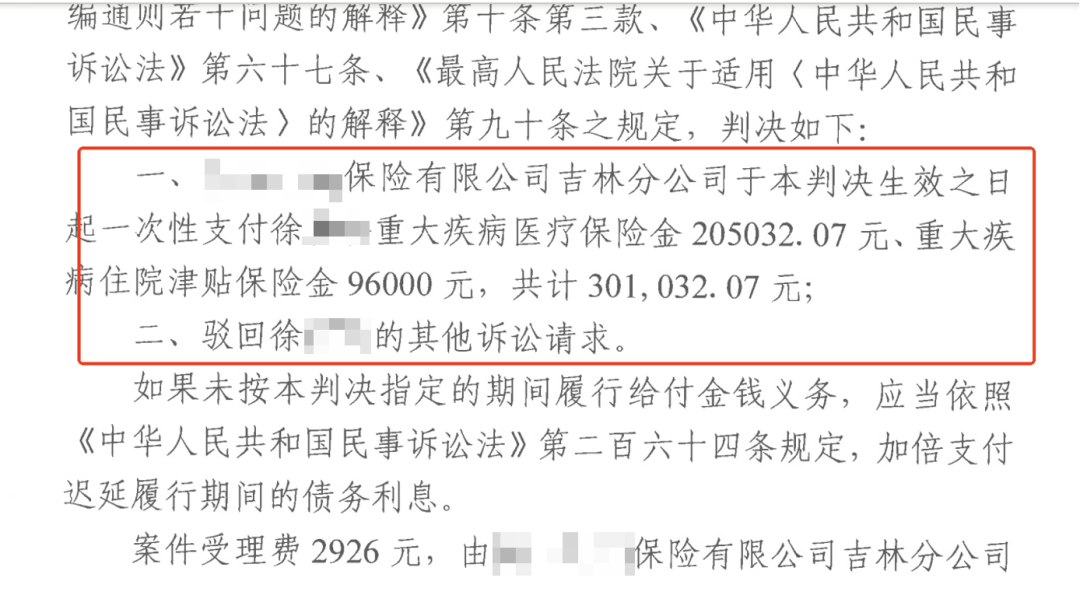 在元甲律师的强力博弈下,保险公司之前的强势态度荡然无存。最终,法院全盘支持元甲律师的代理意见:认定徐女士伤情属于重大疾病。判决保险公司一次性支付医疗保险金及住院津贴共计301,032.07元!