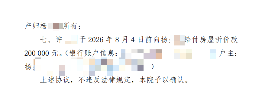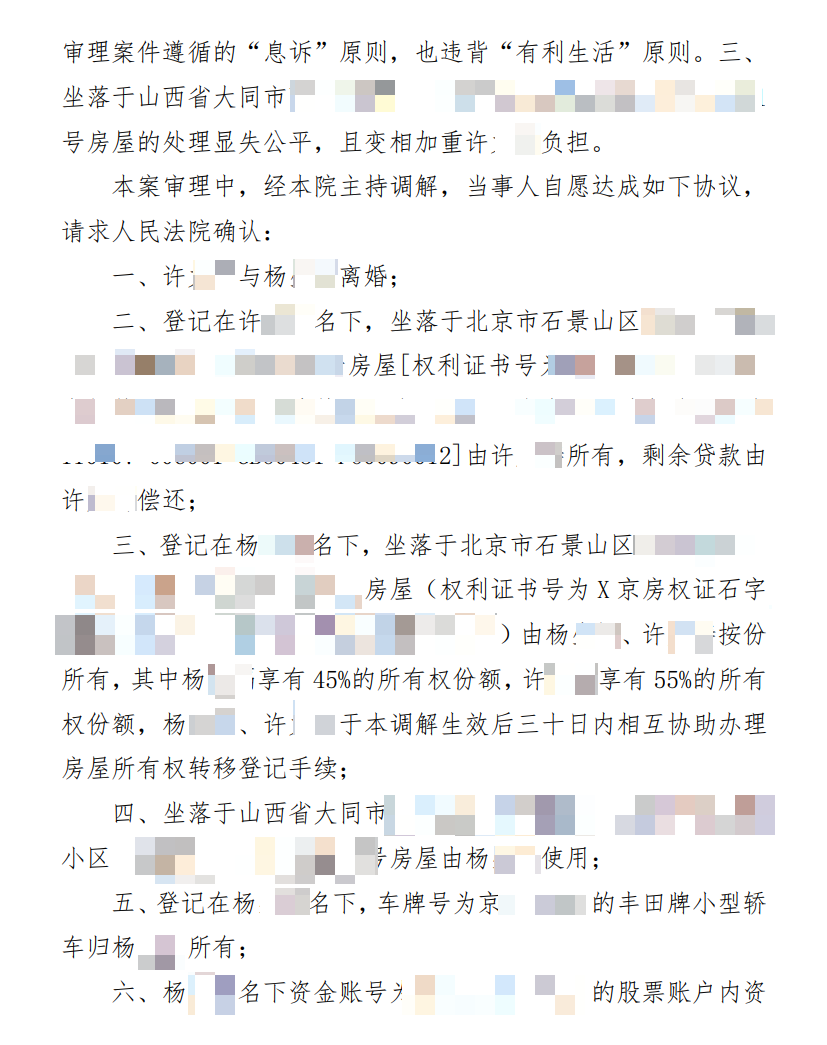 ·理清复杂资产关系:原先约定由许女士使用并需支付11.25万元的外地房产,调解后变更为由前夫使用,许女士无需支付任何费用,彻底从这项潜在负担和后续管理中脱身。