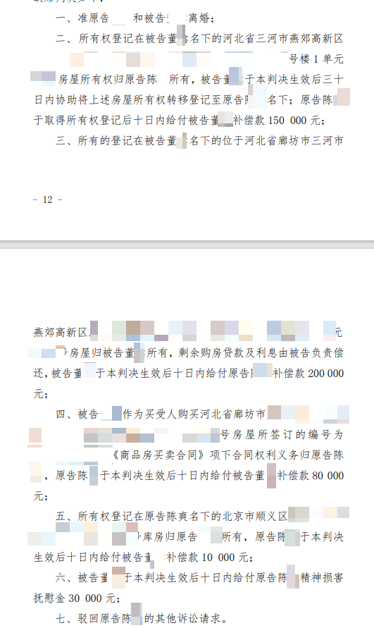· 另一处位于燕郊的房产归董先生,但需支付陈女士补偿款20万元;