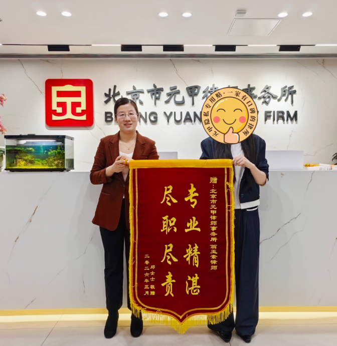 邓女士对此办案结果非常满意,特意为元甲律师送来锦旗一面,以示感谢!
