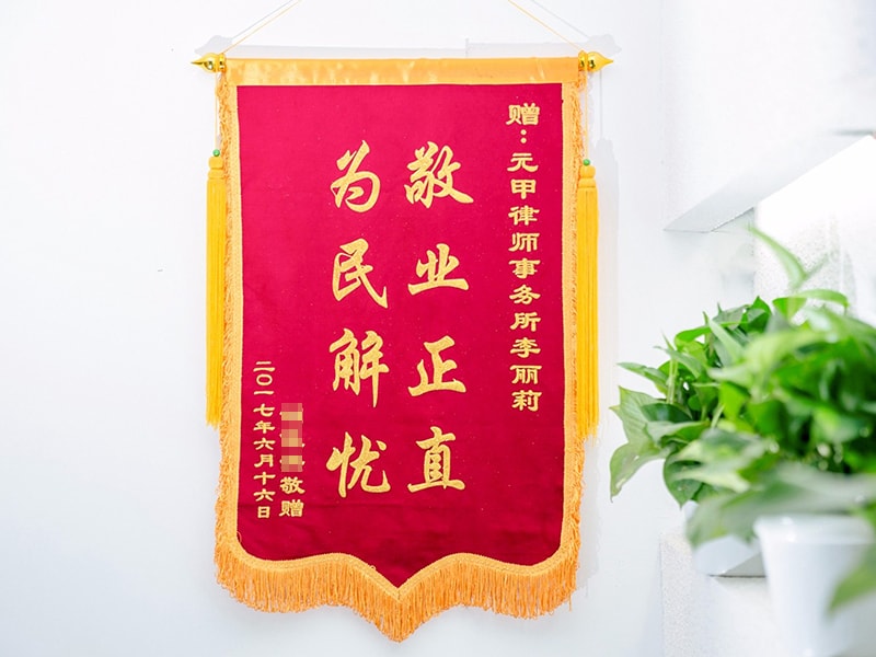 胡女士一家非常感谢元甲律师,于2017年7月20日送来锦旗。