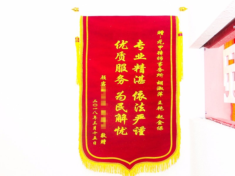 在元甲律师团队和委托人的共同努力下,死者主要责任的情况下,拿到了60多万的赔偿款,收到委托人郎占岐先生送来锦旗一面以表感谢。