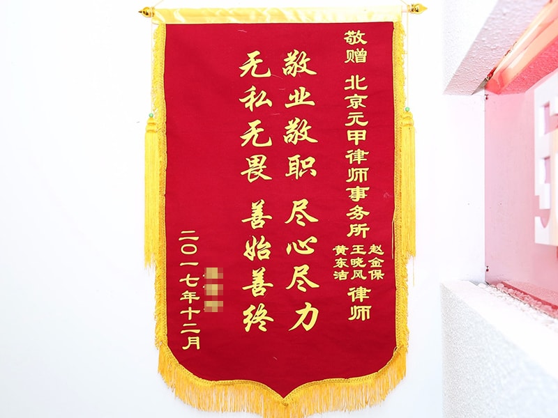 经过多家对比之后,姜女士决定委托专业处理交通事故的元甲律所代为办理。经过元甲团队和姜女士的共同努力之下,姜女士成功按照北京城镇标准获得了将近28万多的赔偿,远超姜女士的预期,为了表示感谢,姜女士特意托人送来锦旗。