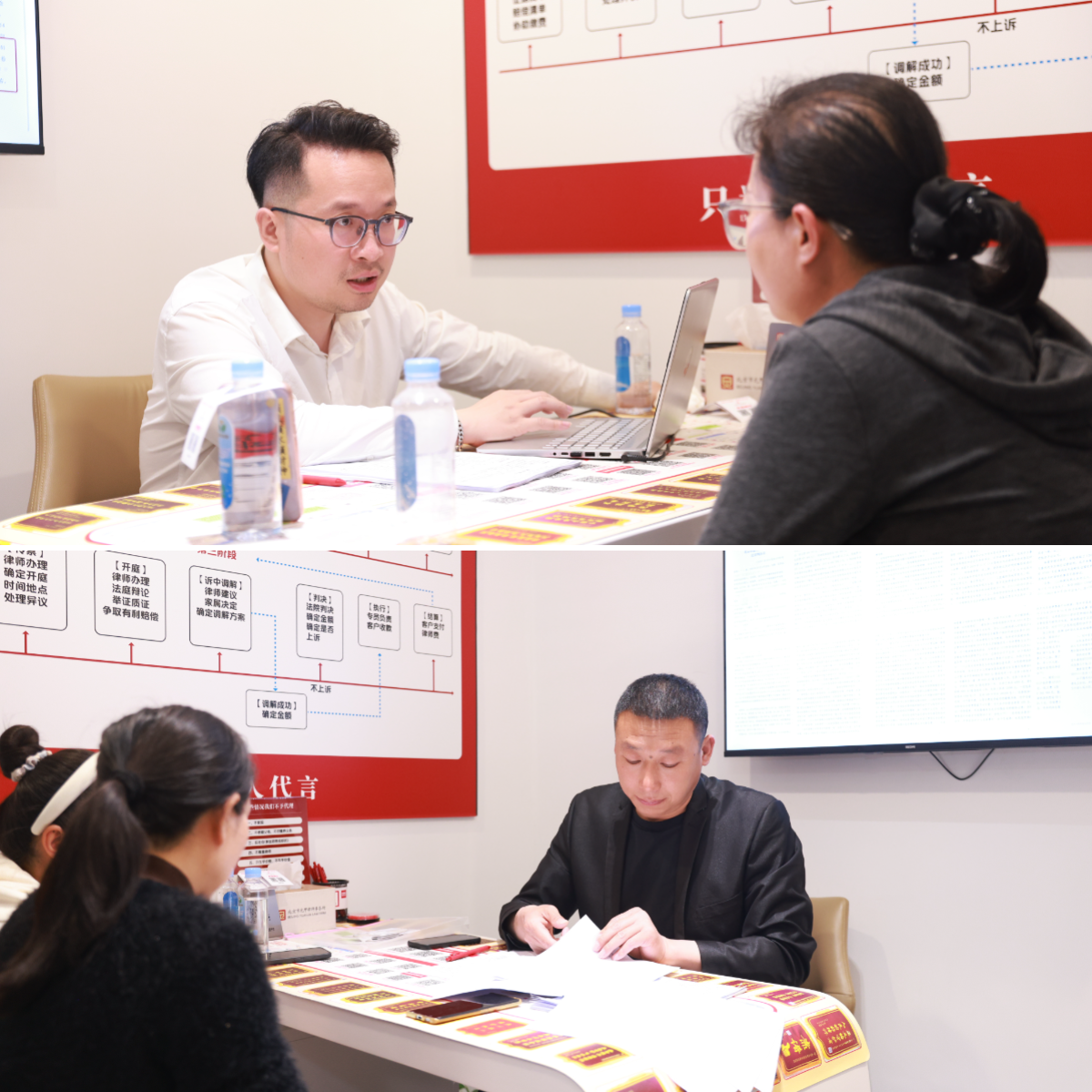 线下咨询区,预约到场的客户跟律师团队面对面深聊。律师们全身心投入,细看每一份材料,从案件关键点、证据短板到解决方案,一条条拆开讲透。