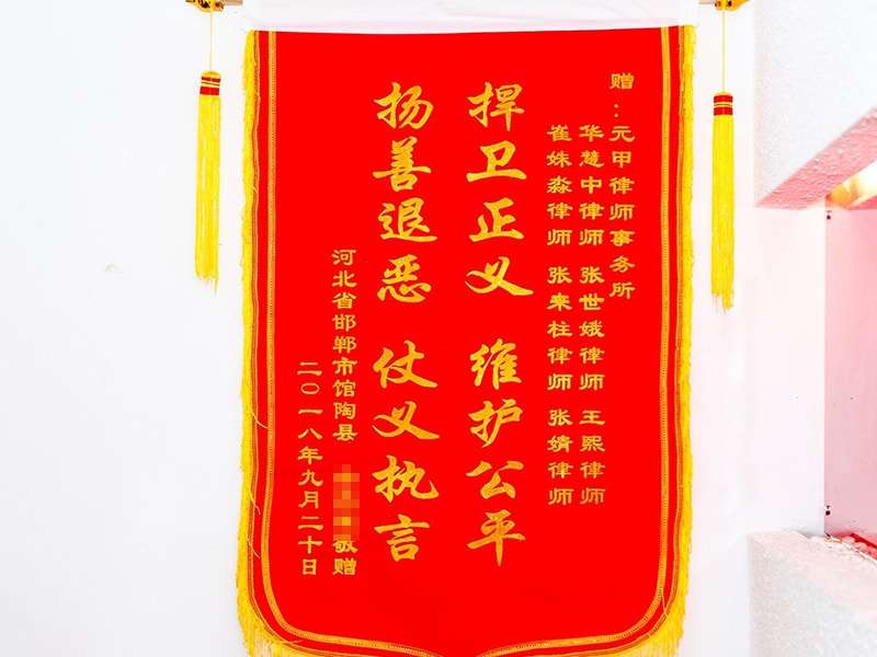 最终在元甲律师团队的努力下,金先生先生获得赔偿60万多元,让金先生及家人感激不已,特送锦旗一面以表感谢。
