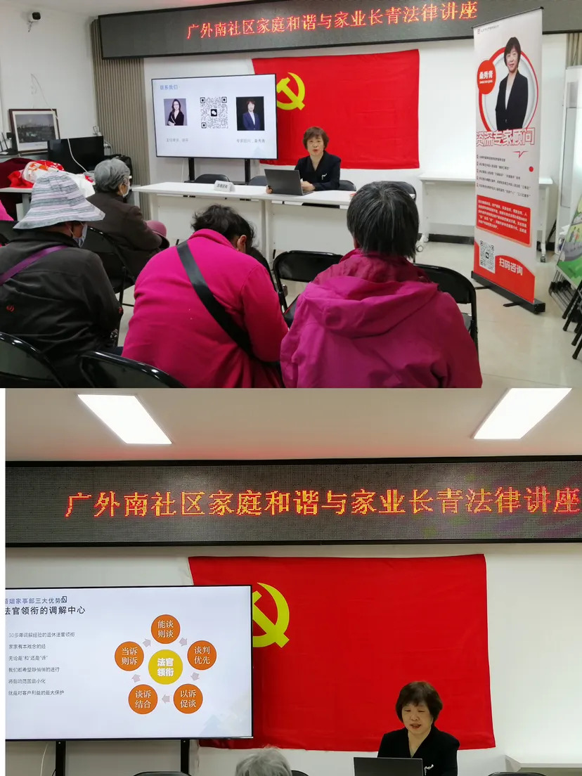 同时,结合社区居民关心的家事问题,将“和谐家庭与家业常青”为主题的婚姻家事公益讲座带进社区。